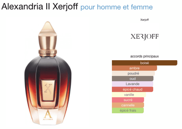 un parfum Orientale boisé pour homme et femme. Alexandria II a été lancé en 2012. Le nez derrière ce parfum est Chris Maurice. Les notes de tête sont Palissandre, Lavande, Cannelle et Pomme; les notes de coeur sont Rose, Cèdre et Muguet; les notes de fond sont Oud, Bois de santal, Ambre, Vanille et Musc.